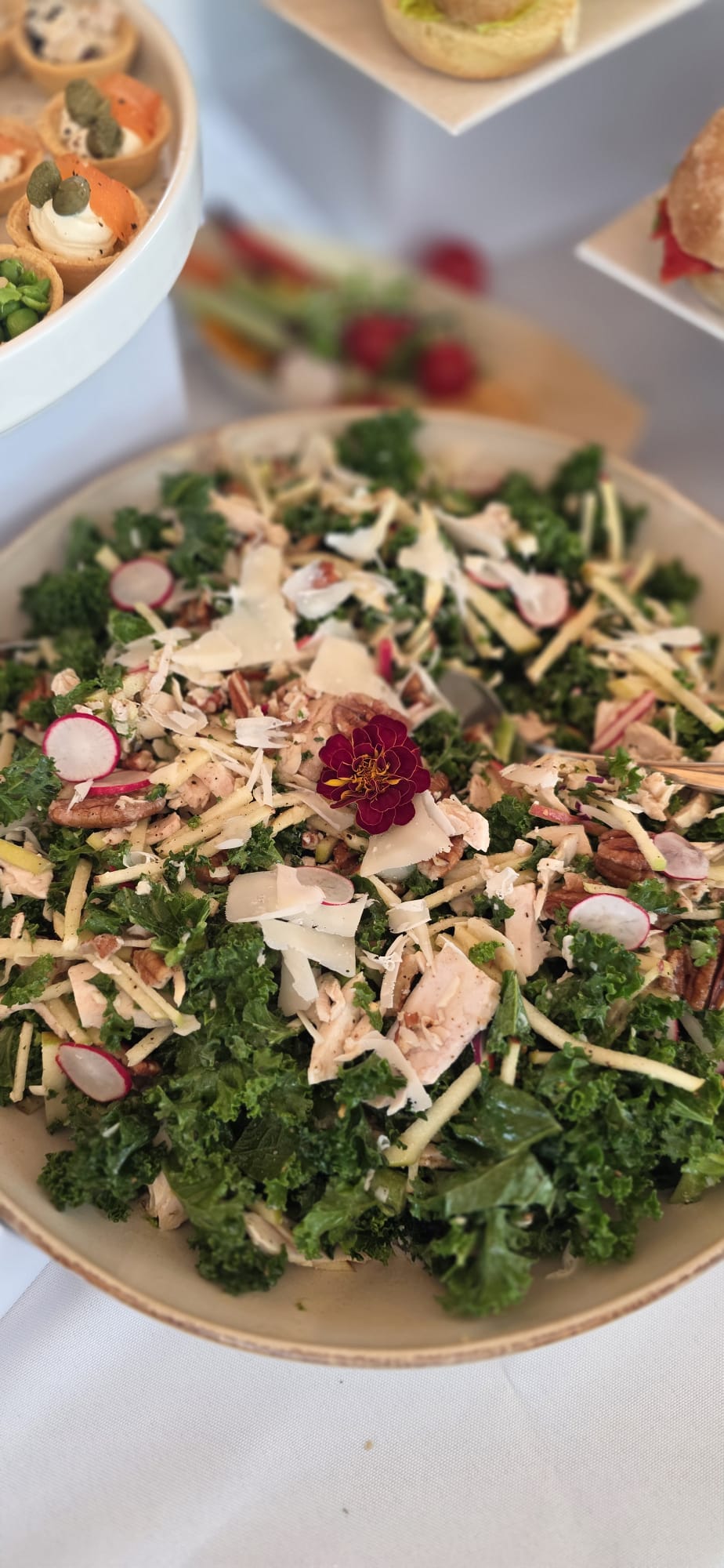 A wholesome mix of kale, apple, radish, pecans, parmesan and tender chicken with a tangy dressing of olive oil, honey and Dijon apple cider vinegar